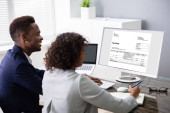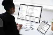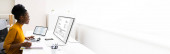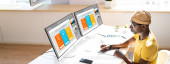 Zdjęcie "Afroamerykański koder za pomocą komputera przy biurku. Programista stron internetowych" może być wykorzystywane do celów osobistych i komercyjnych zgodnie z warunkami zakupionej licencji Royalty-free. Obraz jest dostępny do pobrania w jakości wysokiej rozdzielczości do 5760x3840.