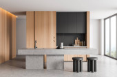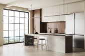 Zdjęcie "Nowoczesne wnętrze kuchni z barem wyspa i siedzenia, widok z boku, szara podłoga betonowa. Minimalistyczne przybory kuchenne i dekoracje, panoramiczne okno na wsi. Renderowanie 3D" może być wykorzystywane do celów osobistych i komercyjnych zgodnie z warunkami zakupionej licencji Royalty-free. Obraz jest dostępny do pobrania w jakości wysokiej rozdzielczości do 5760x3840.