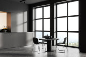 Nowoczesne wnętrze kuchni z barem wyspa i siedzenia, widok z boku, szara podłoga betonowa. Minimalistyczne przybory kuchenne i dekoracje, panoramiczne okno na wsi. Renderowanie 3D