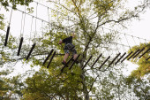 Nastoletni chłopiec w sportowym hełmie ochronnym i sprzęcie bezpieczeństwa jest zaangażowany w działalność linową w parku rozrywki. Widok z dołu
