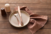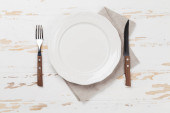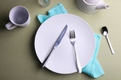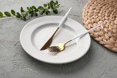 Płyta ze złotym widelcem, nożem i serwetką kuchenną na zielonym tle grunge