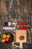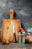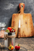 pomidory wiśniowe w puszce i deska do krojenia na ciemnym drewnianym stole przy szarej ścianie. Miejsce na tekst.