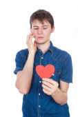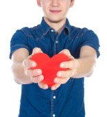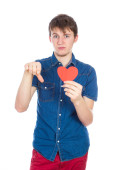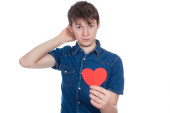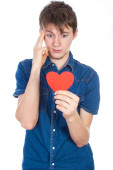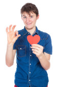 Piękna dziewczyna w niebieski denim koszula stojący na białym tle z czerwonego papieru serca w ręce.