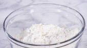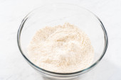 Składniki mieszające w dużej szklanej misce do mieszania do pieczenia babeczki Sharlotka jabłko.
