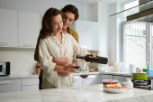 Zdjęcie "Kobieta umieszczenie miski sałatki na stole kuchennym, gdy mąż wylewa wino" może być wykorzystywane do celów osobistych i komercyjnych zgodnie z warunkami zakupionej licencji Royalty-free. Obraz jest dostępny do pobrania w jakości wysokiej rozdzielczości do 5760x3840.
