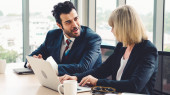 Zajęty zespół analityków w biurze analizujący analizę danych finansowych dla strategii marketingowej w obszarze roboczym przy użyciu pulpitu BI z wykresem i wykresem w celu poprawy wyników biznesowych. Podmiot