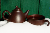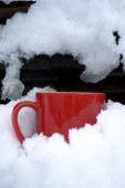 Widok z góry gorącej herbaty w drewnianej filiżance na zimny biały śnieg, na zewnątrz, gorący napój, gorąca herbata, Finlandia, nastrój zimowy, ferie zimowe.