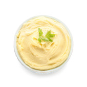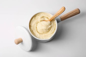Miska ze smacznym serem śmietankowym na żółtym tle