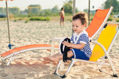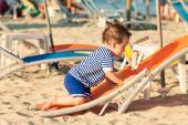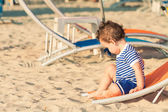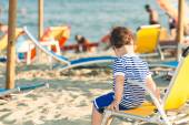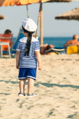 Maluch przebrany za marynarza stojąc na kolanach na plaży i