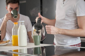 nierozpoznawalny młody czarny człowiek za pomocą blendera do przygotowania kurczaka mielonego w kuchni.