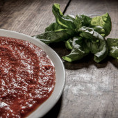 Sos pomidorowy wewnątrz białej płyty na drewnianym stole i innych różnych składników