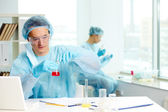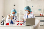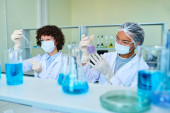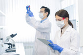 Dwóch młodych interkulturowych kliniczek w fartuchach laboratoryjnych i maskach ochronnych pracujących z płynami w probówkach stojących przy pracy