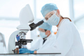 Zdjęcie "Dwóch młodych interkulturowych kliniczek w fartuchach laboratoryjnych i maskach ochronnych pracujących z płynami w probówkach stojących przy pracy" może być wykorzystywane do celów osobistych i komercyjnych zgodnie z warunkami zakupionej licencji Royalty-free. Obraz jest dostępny do pobrania w jakości wysokiej rozdzielczości do 5760x3840.