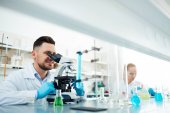 Dojrzałe brunetka kobieta w laboratorium płaszcz i maska patrząc w mikroskop podczas badania komórki nowego wirusa w miejscu pracy wśród kolegów