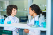 Brunetka kobieta naukowiec z kolbą zawierającą substancję płynną patrząc na ekran smartfona podczas przewijania jego właściwości