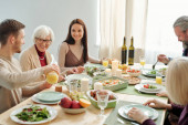 Starsza para trzymająca się za ręce przy świątecznym stole serwowanym z domowym jedzeniem i napojami podczas modlitwy przed rodzinną kolacją