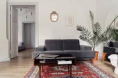 Część wnętrza przestronny salon nowoczesny apartament z szarą wygodną kanapą z poduszkami stojącymi między zielonymi roślinami