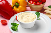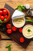Miski smacznego sera śmietankowego i sosu na stole
