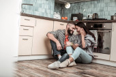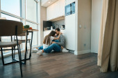 Szczęśliwi młodzi małżonkowie siedzieć przytulając się na podłodze w kuchni, widok w pomieszczeniach