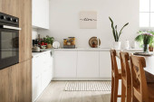 Zdjęcie "Wnętrze jasnej kuchni z wbudowanym piekarnikiem, stołem, krzesłami i białymi licznikami" może być wykorzystywane do celów osobistych i komercyjnych zgodnie z warunkami zakupionej licencji Royalty-free. Obraz jest dostępny do pobrania w jakości wysokiej rozdzielczości do 5760x3840.