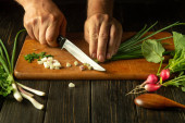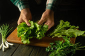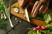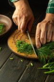 Mężczyzna wyciął świeży koper nożem na kuchennej desce do krojenia przed przygotowaniem dań krajowych lub wegetariańskich. Cięcie foeniculum w domu.