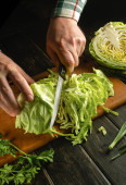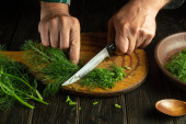 Zdjęcie "Mężczyzna wyciął świeży koper nożem na kuchennej desce do krojenia przed przygotowaniem dań krajowych lub wegetariańskich. Cięcie foeniculum w domu." może być wykorzystywane do celów osobistych i komercyjnych zgodnie z warunkami zakupionej licencji Royalty-free. Obraz jest dostępny do pobrania w jakości wysokiej rozdzielczości do 5760x3840.
