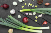 Deska z różnymi rodzajami cebuli na grunge czarne tło