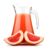 Dzbanek soku pomidorowego i owoce z zielonych liści na białym tle