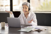 Zdjęcie "Obsługa klienta. Hotline Operator Lady Noszenie słuchawki i Dokonywanie połączeń wideo na laptopie, Zapewnienie obsługi klienta i usługi Siedząc w nowoczesnym biurze w pomieszczeniach. Komunikacja biznesowa" może być wykorzystywane do celów osobistych i komercyjnych zgodnie z warunkami zakupionej licencji Royalty-free. Obraz jest dostępny do pobrania w jakości wysokiej rozdzielczości do 5760x3840.