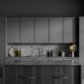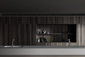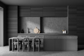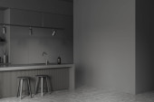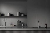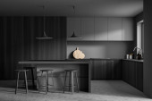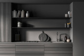 Zdjęcie "Ciemne wnętrze kuchni z barem wyspa, zlewozmywak i kuchenka. Naczynia kuchenne i naczynia na półce, lampy. Renderowanie 3D" może być wykorzystywane do celów osobistych i komercyjnych zgodnie z warunkami zakupionej licencji Royalty-free. Obraz jest dostępny do pobrania w jakości wysokiej rozdzielczości do 5760x3840.