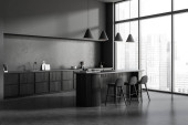 Ciemne wnętrze kuchni z barem wyspa, zlewozmywak i kuchenka. Naczynia kuchenne i naczynia na półce, lampy. Renderowanie 3D