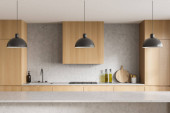 Zdjęcie "Jasne wnętrze kuchni z kwarcowym barem wyspa z umywalką, naczynia kuchenne na minimalistycznym pokładzie. Ukryte drewniane półki w stylowej przestrzeni kuchennej. Renderowanie 3D" może być wykorzystywane do celów osobistych i komercyjnych zgodnie z warunkami zakupionej licencji Royalty-free. Obraz jest dostępny do pobrania w jakości wysokiej rozdzielczości do 5760x3840.