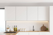 Jasne wnętrze kuchni z kwarcowym barem wyspa z umywalką, naczynia kuchenne na minimalistycznym pokładzie. Ukryte drewniane półki w stylowej przestrzeni kuchennej. Renderowanie 3D