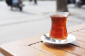 Tradycyjna turecka herbata serwowana w kieliszkach w kształcie tulipanów w kawiarni lub restauracji w Stambule, Turcja
