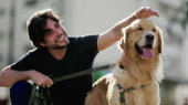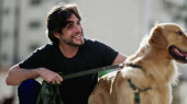 Szczęśliwa para ciesząca się weekendową aktywnością z psem na zewnątrz parku miejskiego. Szczery mężczyzna i kobieta i ich zwierzak Golden Retriever. Scena Millennial Lifestyle