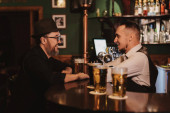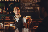 szczęśliwy mężczyzna i kobieta stukanie okulary z piwa w barze licznik w pubie