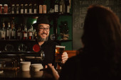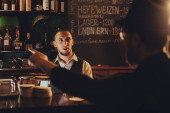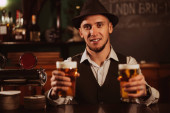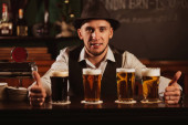 barman w kapeluszu z brodą przy barze z piwem w szklankach w pubie
