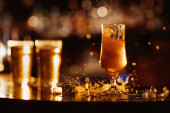 glass of unfiltered draft golden foam beer with on bar counter with ice in the restaurant