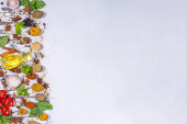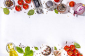 Białe tło gotowania z przydatnych składników włoskiej kuchni śródziemnomorskiej - pomidory, liście bazylii, zielenina, oliwa z oliwek, sól, pieprz, czosnek, płaski leżak biały stół góra widok przestrzeń skopiować