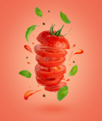 Zdjęcie "Latające składniki pomidorów, bazylia, czarny pieprz na białym tle." może być wykorzystywane do celów osobistych i komercyjnych zgodnie z warunkami zakupionej licencji Royalty-free. Obraz jest dostępny do pobrania w jakości wysokiej rozdzielczości do 5760x3840.