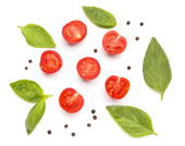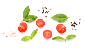 Latające składniki pomidorów, bazylia, czarny pieprz na białym tle.