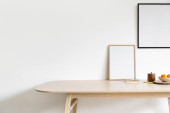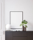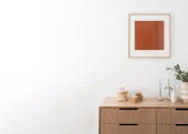 Wnętrze salonu z drewnianą konsolą, lampą i rośliną w doniczce na stole. Biała ściana z ramą z makietą na kredensie w korytarzu apartamentowym, ujęcie pionowe