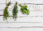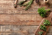 Butelki olejku eterycznego, świeże i suche rozmaryn na drewnianym stole, widok z góry. Miejsce na tekst