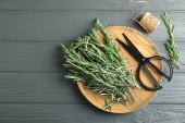 Zdjęcie "Butelki olejku eterycznego, świeże i suche rozmaryn na drewnianym stole, widok z góry. Miejsce na tekst" może być wykorzystywane do celów osobistych i komercyjnych zgodnie z warunkami zakupionej licencji Royalty-free. Obraz jest dostępny do pobrania w jakości wysokiej rozdzielczości do 5760x3840.