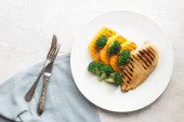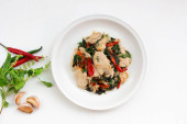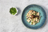 Zdjęcie "Grillowana sałatka z grzybów z kolendry orzeszki ziemne cytryna w misce na białym tle łupkowym, widok z góry, wegańskie zdrowej żywności koncepcja." może być wykorzystywane do celów osobistych i komercyjnych zgodnie z warunkami zakupionej licencji Royalty-free. Obraz jest dostępny do pobrania w jakości wysokiej rozdzielczości do 5760x3840.