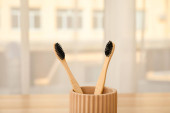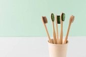 Bambusowe szczoteczki do zębów w uchwycie na beżowym tle