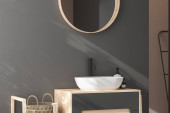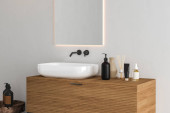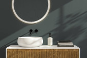 nowoczesne wnętrze łazienki z lustrem i lampą na szarej ścianie, renderowanie 3 d
