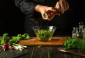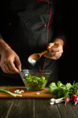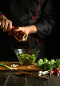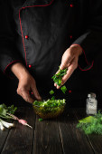 Szef kuchni dodaje ser do miski sałatkowej na stole kuchennym. Gotowanie dania wegetariańskiego przez ręce kucharza w kuchni restauracji