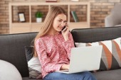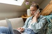 Kobieta freelancer z laptopem rozmowy przez telefon komórkowy w sypialni