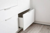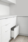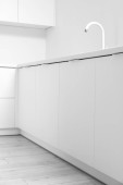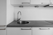 Wnętrze jasnej kuchni z białymi szufladami i zlewem